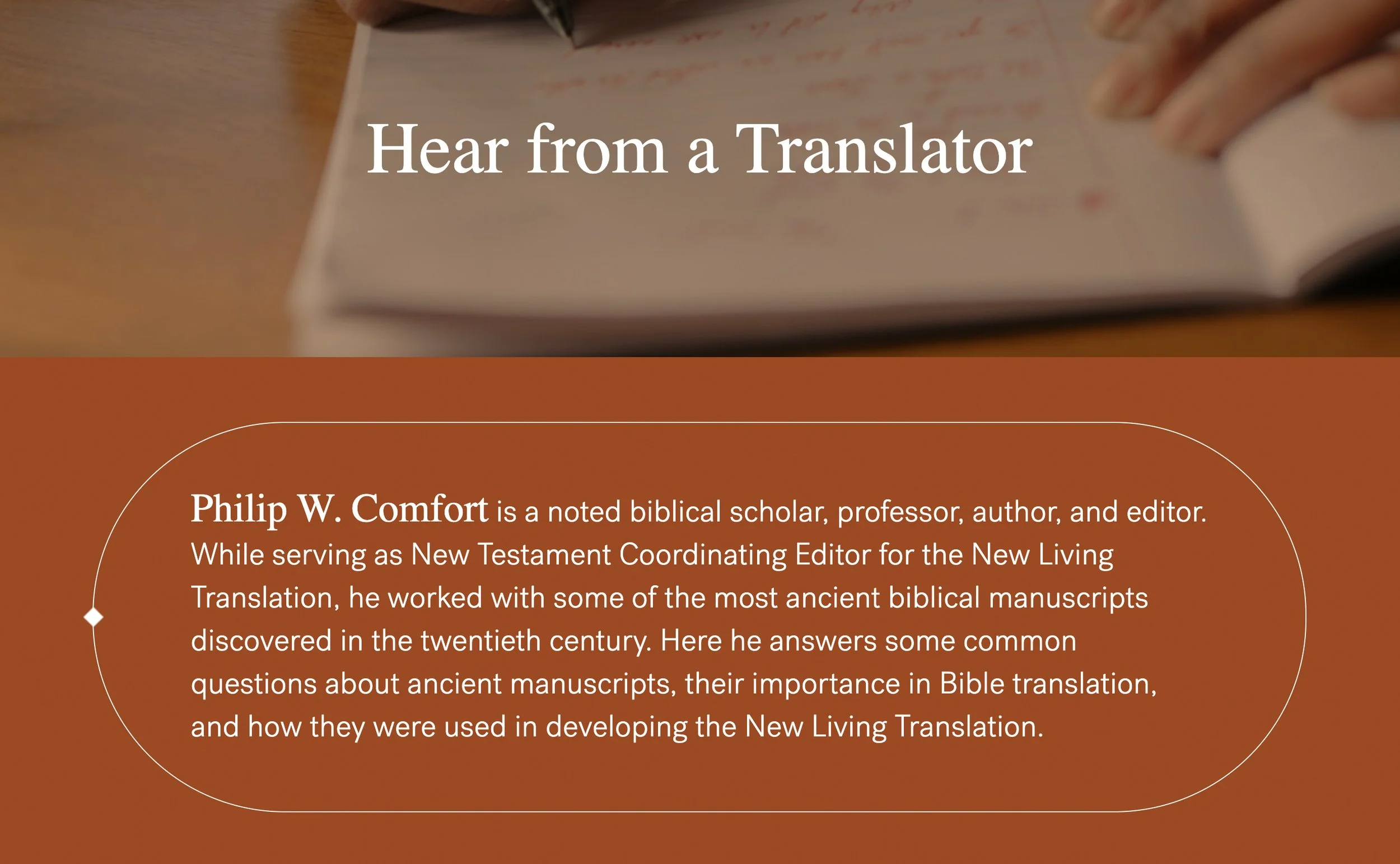 My team provided advice and feedback on the content organization, site structure, and hierarchy. The content of this site is intentionally translation focused, leaving off product selling and promotion. Our hope was the user would leave this site with a better understanding of the NLT as compared to other Bible translations.
